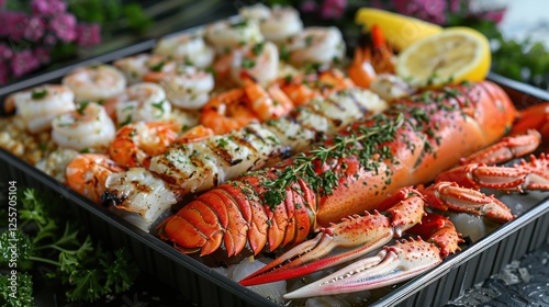 A seafood platter with grilled lobster, crab legs, shrimp, and lemon wedges, high detail