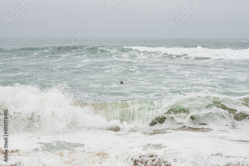 A seal's head pops out of the surf on a foggy day at a beach near Santa Cruz, California