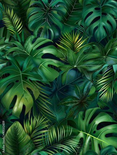 A seamless exotic pattern featuring tropical leaves with lush greenery, rendered in watercolor style