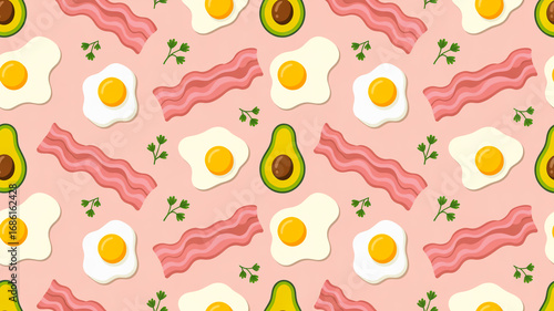 A seamless pattern design of breakfast items on a light pink backgrou