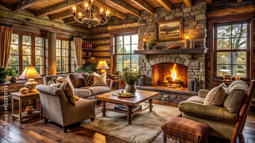 A secluded retreat where rustic charm meets warmth, a crackling fire provides a comforting ambiance, wrapped in soft textures and muted hues that soothe the soul.