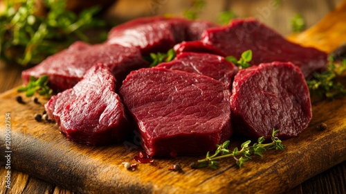 A selection of raw beef cuts, such as fillet, sirloin, and brisket, neatly arranged on a wooden butcher's block, with minimal garnishing of herbs
