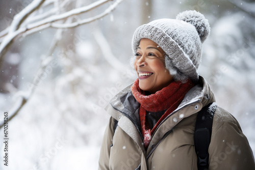 A senior african american woman is walking happily with a winter coat and a winter hat in a in snow covered forest during day in winter while snowing