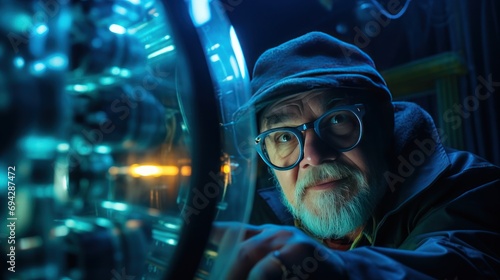 A senior cinematographer at work looks through a window from a screening room behind the stage.