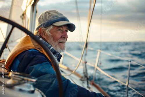 A senior man contentedly sailing on a sailboat in the open sea, surrounded by the vastness of the ocean, the scene softly blurred