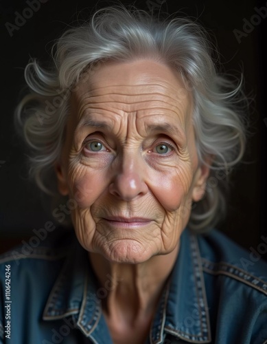 A senior woman from Russia gazes directly at viewer, highlighting her wise, expressive features. Soft lighting creates a warm atmosphere, emphasizing her character and life experience. Generative AI