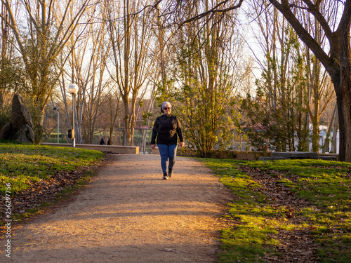 A senior woman with white hair listening to music with headphones walking in an urban park