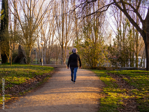 A senior woman with white hair listening to music with headphones walking in an urban park