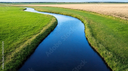 river, field, nature, serene, aerial, view, wind, surround, lush, green, gold, beauty, rural, wetland, shore, duck pond, crop, park, landform, pasture, sky, farmland, meadow, source, blue, peace, fresh, water, spring