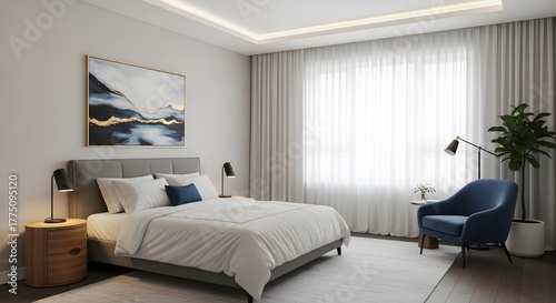 bedchamber, interior, design, modern, elegant, decor, home, furniture, bed, pillow, duvet, nightstand, lamp, armchair, blue, curtain, window, light, natural, painting, artwork, wall, floor, rug, plant, green, serene, calm, peaceful, cosy, comfortable, stylish, chic, contemporary, minimalist, roomy, bright, inviting, restful, relaxation, sleep, private, domestic, residential, dwelling, room, space, architecture