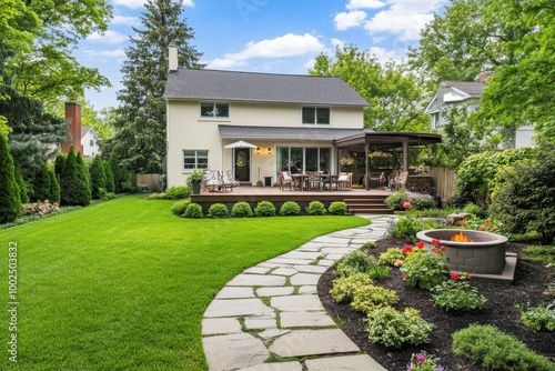 backyard, garden, house, patio, lawn, flower, tree, landscaping, stone, seating, greenery, relaxation, nature, plant, pathway, deck, summer, home, calmness, leisure, architecture, design, space, environment, shrub, view, scenery, cosy, inviting, family, gathering, sunlight, enjoyment, aesthetic, peaceful, vibrant, layout, decor, residential, comfort, style, maintenance, beauty, retreat, ambience, harmony