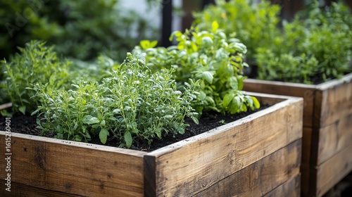 garden, planter, herb, serene, backyard, feature, wooden, box, rimmed, fresh, foliage, blossom, home, sunlight, crop, yard, urban, farm, harvest, rustic, peaceful, wood, glisten, morning, earth, realism, landscape, nature, design