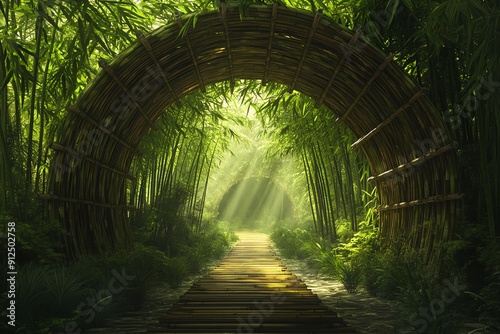 A serene bamboo grove pathway with sunlight filtering through, creating a tranquil and inviting atmosphere.