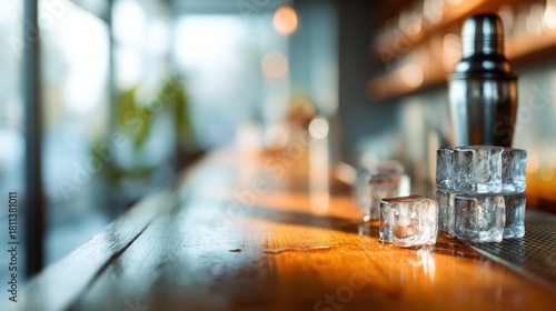 A serene bar scene featuring ice cubes on a wooden counter, with blurred lights and a cocktail shaker in the background, creating a warm atmosphere.
