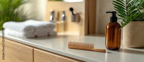 A serene bathroom scene featuring towels, a natural comb, and a stylish bottle on a countertop with greenery.
