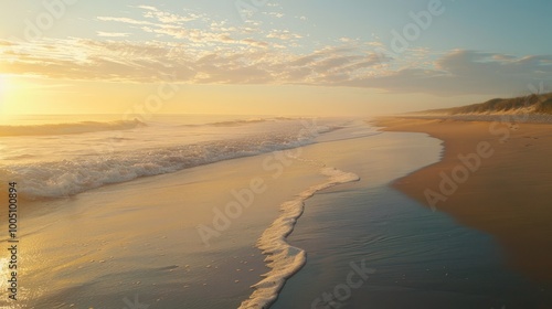A serene beach at sunrise with soft golden light reflecting on the calm waves, creating a peaceful atmosphere