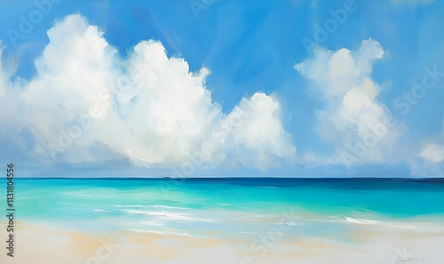 A serene beach scene with turquoise waters and fluffy clouds under a bright blue sky.