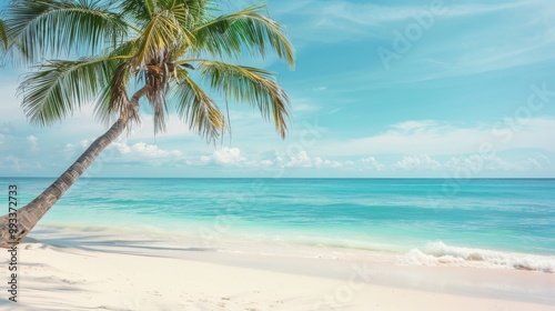 A serene beach with beautiful turquoise waters, a white sandy shore, and a palm tree gracefully swaying in the warm breeze.
