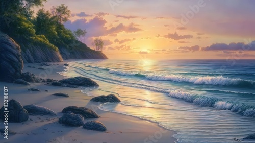 A serene beach with scattered rocks along the shore, the gentle waves caressing the stones, and a peaceful sunrise illuminating the horizon.