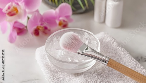 A serene beauty scene featuring a soft brush resting in a bowl, surrounded by orchids and a towel, ideal for skincare and relaxation.