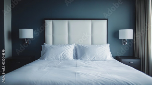 A serene bedroom featuring a neatly made bed with clean white sheets and stylish lamps against a calming dark blue wall