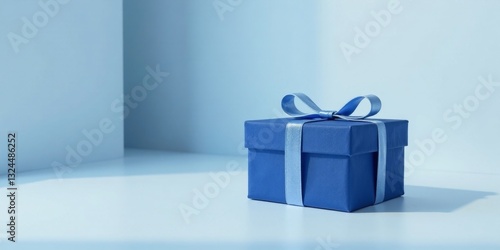 A Serene Blue Gift Box with a Delicate Ribbon, Resting on a Smooth, Pale Surface in Soft Light