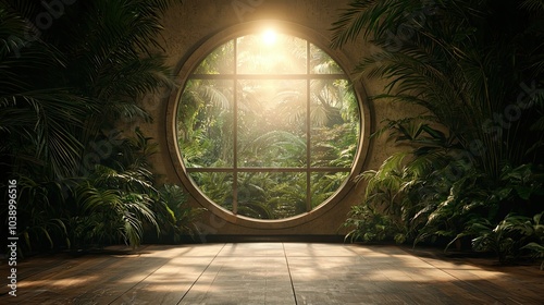 A serene, circular window frames a sunlit jungle, with lush greenery creating a tranquil indoor-outdoor atmosphere.
