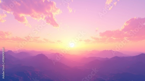 A serene depiction of a mountain range bathed in soft pastel hues at dawn, showcasing the beauty of nature under the glowing morning sky with a rising sun.