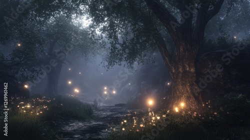 enchanted forest, mystical, pathway, magical, serene, nature, tranquil, flora, dreamlike, scenic, illuminated, greenery, timberland, lichterkette, peaceful, fantasy, fantastical, calm, night scene, natural beauty, mystery, wonder, imagination, soothing, serenity, dreamy