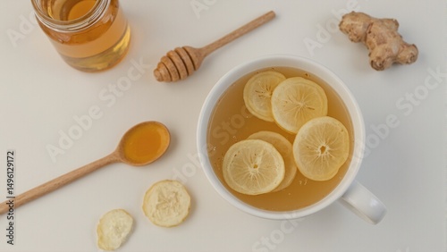 A serene flat lay captures a morning wellness routine with a cozy ceramic mug of tea sliced ginger and a spoonful of manuka honey