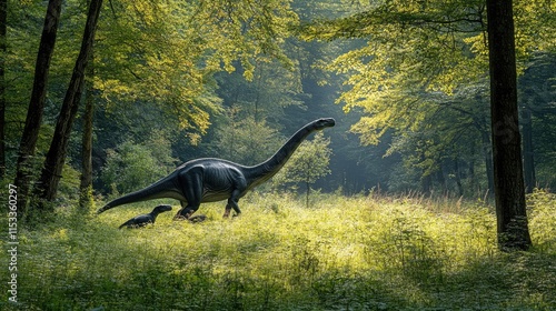 dinosaur, forest, nature, prehistoric, wildlife, vegetation, sunlight, calmness, habitat, species, evolution, ecology, environment, grass, tree, landscape, fauna, flora, scene, ancient, jurassic, cretaceous, herbivore, predator, ecosystem, biodiversity, adventure, exploration, realism, model, sculpture, art, photo, shadow, depth, serenity, beauty, wilderness, time, history, life, creature, scale, movement, family, nurturing