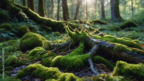 A serene forest scene featuring moss-covered roots and sunlight filtering through trees.