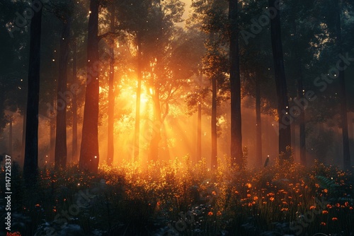 A serene forest scene illuminated by golden sunlight filtering through trees and flowers.