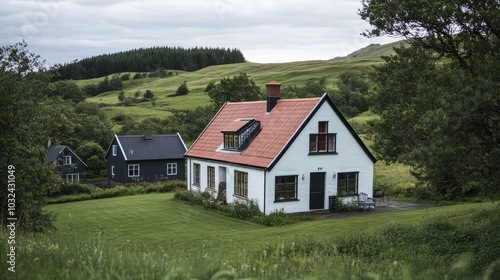 house, landscape, grass, tree, roof, sky, window, nature, rural, architecture, garden, property, peaceful, scenic, hillside, home, environment, country, view, calmness, bungalow, residential, building, area, lawn, countryside, scenery, relaxation, shelter, dwelling, charme, design, setting, location, inviting, greenery, space, horizon, sunlight, escape, retreat, simplicity