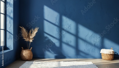 a serene interior corner features a deep blue textured wall dramatically lit by window shadows, complemented by natural woven baskets and a plush white rug.