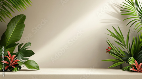 A serene interior scene featuring lush greenery and vibrant plants against a neutral backdrop, creating a tranquil atmosphere.