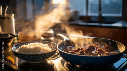 A serene kitchen scene with a pot of beef simmering on the stove beside a bowl of freshly cooked rice, showcasing the comforting preparation of a home-cooked meal.