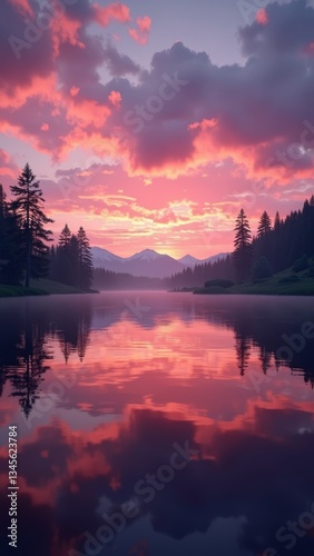 A serene lake scene at sunset, with mountains and trees reflected in the water