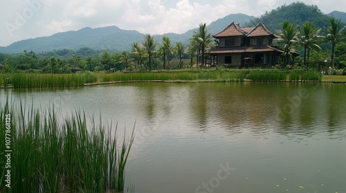 A serene landscape featuring a house by a pond surrounded by mountains and palm trees.