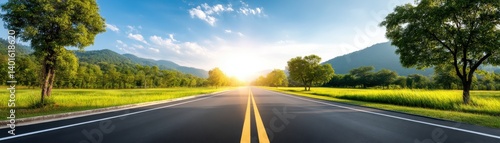 road, landscape, nature, sunrise, greenery, serene, calmness, escape, exploration, peaceful, sunshine, vibrant, direction, open, relaxation, journey, horizon, wildlife, picturesque, scenery, calm, sunlight, daylight, foliage, mountain, pathway, scenic, rural, morning, asphalt, blue, sky, destination, vacation, beauty, wanderlust, bright, adventure, environment, travel, summer, fresh, countryside, view