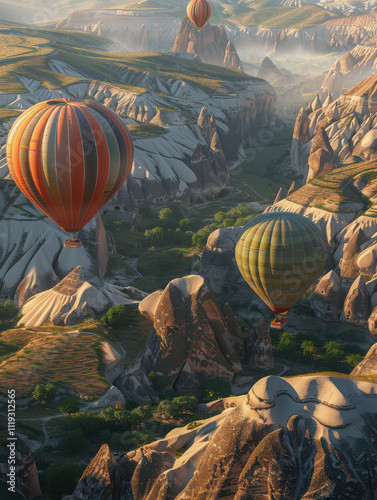 A serene landscape featuring colorful hot air balloons floating over unique rock formations.