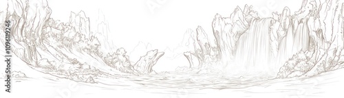 A serene landscape sketch featuring waterfalls and rocky formations.