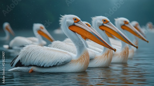 A serene lineup of white pelicans with orange beaks floating gracefully on water at dusk
