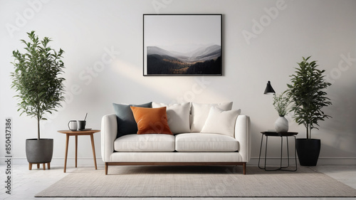 A serene living room setup with a minimalist armchair against a white wall background, accentuating clean lines and understated elegance, Generative AI