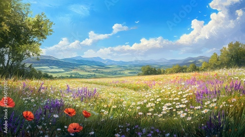 A serene meadow filled with wildflowers, including daisies, poppies, and lavender, creating a colorful and vibrant natural setting under a sunny blue sky