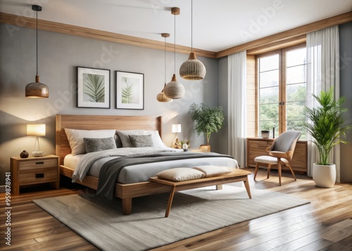 A serene modern bedroom incorporates Scandinavian-inspired furniture, characterized by neutral color palettes, sleek