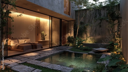 modern, architecture, bedchamber, pool, garden, glasses, light, nature, design, calmness, relaxation, space, interior, exterior, foliage, stone, water, ambience, minimalist, aesthetic, comfort, luxury, home, retreat, landscape, atmosphere, plant, serenity, style, contemporary, chic, flora, decor, harmony, peaceful, sunlight, evening, indoor, living, environment, setting, cosy, elegance, leisure, privacy, simplicity, warmth, escape