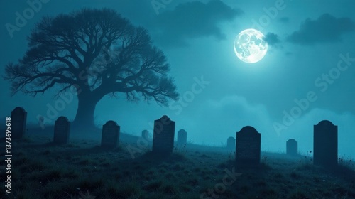 A Serene Nighttime Cemetery Scene Under a Full Moon's Glow, Featuring Silhouetted Headstones and an Ancient Tree