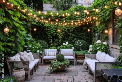 A serene outdoor patio with comfortable seating, lush greenery, and string lights for a magical ambiance, Generative AI