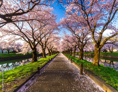 path, blossom, cherry, tree, pink, flower, canal, water, spring, nature, beauty, japan, landscape, garden, sky, blue, green, grass, peaceful, tranquil, scenic, pathway, alley, japanese, park, light, colours, vibrant